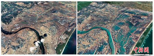 仙臺地區(qū)海嘯地震前后對比圖。