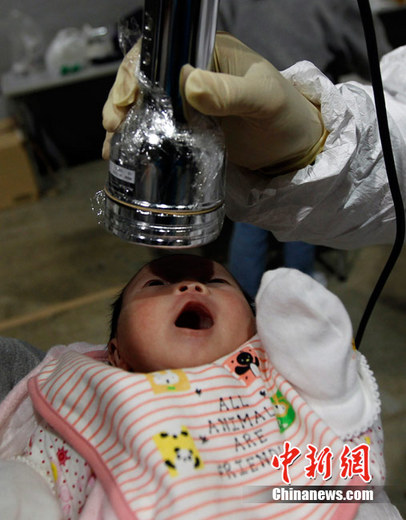 ??? 2011年3月31日,日本福島縣一個避難所內(nèi),出生于3月15日嬰兒Nagashima Rio正在接受核輻射檢測。她所在的避難所距離福島第一核電站大約70公里。而他所出生的醫(yī)院距離福島第一核電站只有約50公里。