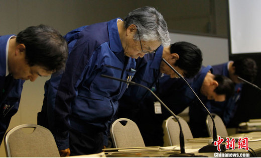 ????2011年3月28日,東京,東京電力公司召開新聞發(fā)布會,通報福島核電站最新輻射情況,公司高管就“福島核電站積水輻射超標(biāo)數(shù)值錯誤”的問題,向民眾鞠躬道歉。