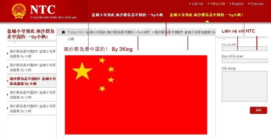 ????據(jù)記者觀察,自稱來自鹽城的黑客在越南外交部網(wǎng)站首頁上留下了署名“3King”與“小楓”。目前該網(wǎng)站正中央貼著一面五星紅旗,網(wǎng)頁的左側(cè)及子鏈接均寫有“南沙群島是中國的!”等字樣。網(wǎng)頁下方分別用中英文寫著“南沙群島是中國的!過去是 現(xiàn)在是 將來也是!”。與此同時(shí),網(wǎng)站內(nèi)還在不停地播放著中國國歌《義勇軍進(jìn)行曲》。