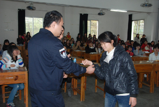 課堂上,民警賁鳴根據以往的工作經驗,以風趣幽默的語言、互問互答的形式,通過真實的映像資料,向同學們介紹了當前跟同學們息息相關的“兩搶一盜”等街面案件的特點,教育同學們在遇到搶劫、搶奪、入室盜竊等違法犯罪時,應當如何冷靜處置,確保自身的安全。在一問一答過程中,同學們積極發言,現場氣氛非常輕松活躍,一改以往安全教育課嚴肅、沉寂的形式。