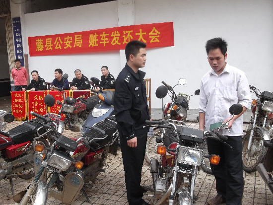 梧州零距離網(wǎng)訊(通訊員 朱庭源)3月22日,藤縣公安局太平派出所隆重召開贓物返還大會,將在“百日行動”中繳獲的1輛面包車和20輛兩輪摩托車返還給被盜的失主。公安局副局長黃燕飛、太平鎮(zhèn)黨委、政府領導出席了返還大會。