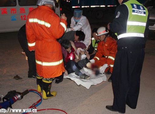 當(dāng)日凌晨4時(shí)43分,岑溪市消防大隊(duì)接到報(bào)警,位于市北環(huán)大道原松香廠大門口處一輛摩托車發(fā)生事故,一位老婦人左腳卷入摩托車后輪。消防官兵立即出動(dòng),4時(shí)47分到場,只見一輛車牌為桂DMS980的二輪摩托車后座上坐著一位老婦,左腳膝蓋以下部位均被摩托車后輪以及鏈條等卡住,車身在兩名男子的支撐下斜臥于路面,厚厚的一層鮮血在摩托車底下流淌,先到場的交警和醫(yī)護(hù)人員已為傷者輸液止痛,并一直在安撫傷者,穩(wěn)定其情緒。