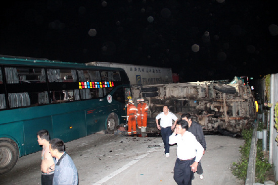 現(xiàn)場(chǎng)一輛粵S75336的大客車與牌照為桂KA063掛的掛車追尾后黏在一起,旁邊一輛車牌為桂J02837的運(yùn)雞貨車橫亙于兩車交接部位,三車前方20米左右的地方停放著一輛被追尾的大貨車。此時(shí)的事故現(xiàn)場(chǎng)灑滿了雞籠和汽車殘骸碎片,數(shù)百只雞滿地亂竄。