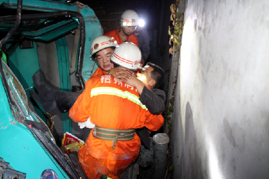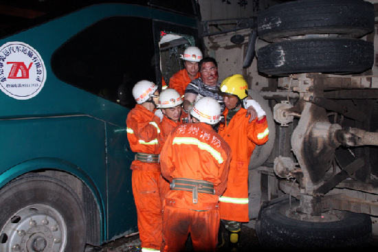 經(jīng)過消防官兵仔細(xì)搜尋發(fā)現(xiàn),大客車司機(jī)和運(yùn)雞貨車司機(jī)兩人受困于駕駛室,其余人員均安全逃生撤離,消防官兵立即將運(yùn)雞貨車司機(jī)救出并交予醫(yī)護(hù)人員治療。由于大客車車頭深深的陷入掛車尾部,司機(jī)左腿嚴(yán)重被夾,救援難度較大,經(jīng)過多方測(cè)試,救援人員決定利用切割機(jī)、液壓鉗、撬棍等工具,采取破拆客車車頭底部移開車內(nèi)雜物的方法營救司機(jī)。1時(shí)58分,客車司機(jī)被救出,至此兩名受傷被困的司機(jī)全部救出并送往當(dāng)?shù)蒯t(yī)院治療。