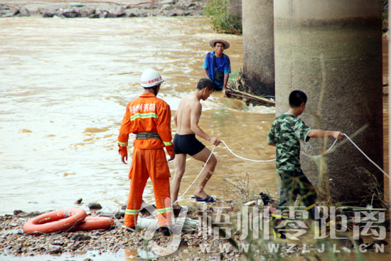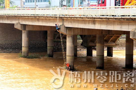 當日9時30分許,岑溪大隊接到報警后,立即派出1輛搶險救援車,6名官兵趕赴事發地岑溪大橋。只見一頭戴草帽的男子站在大橋位于義昌江江心的橋墩下,大腿以下都被淹沒在江水中。近期連日降雨,江水渾濁湍急,男子只有扶住橋墩,靠橋墩減緩洪水的沖擊才能站穩,稍一移步,就有被江水沖走的危險。男子被困處離江岸太遠,從岸邊涉水救人危險性大。消防員經觀察發現,大橋約7至8米高,可使用救生軟梯從大橋上下降至男子被困處救人。消防員在大橋上找準男子被困處正上方的橋段,放下軟梯,攜帶安全繩沿軟梯下到男子處,為被困男子系上安全繩,并固定軟梯下端,防止軟梯擺動影響安全攀爬。被困男子在消防員的幫助下順梯慢慢爬上大橋,安全獲救。整個救援過程僅用時5分鐘。