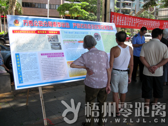 梧州零距離網訊(通訊員 陳巧良)6月18日,梧州市公安局萬秀區分局與萬秀區工商局、中國人民銀行梧州分行攜手在市鴛江麗巷廣場開展了以“嚴厲打擊經濟犯罪,強力推進‘破案會戰’”為主題的集中宣傳活動。活動通過發放宣傳資料、接受市民咨詢、講解辨假知識等方式向市民宣傳
