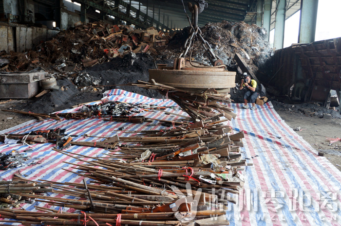 6月21日上午,我市公安將收繳到一批非法槍支及管制刀具等物品集中投入鋼鐵廠的煉鋼爐中銷毀。覃燕霞 攝