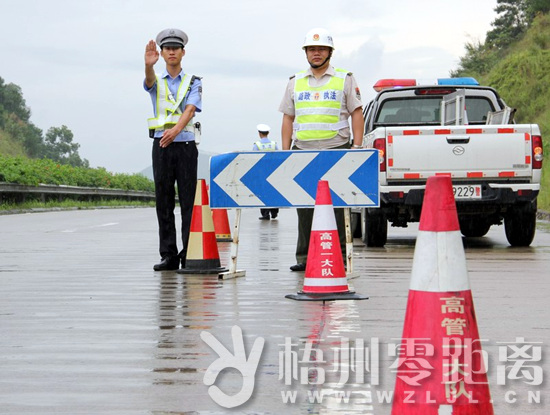 梧州交警高速一、三大隊(duì)民警聞警而動,火速啟動《高速公路防汛救災(zāi)搶險應(yīng)急預(yù)案》,拉響警笛在雨中奔赴現(xiàn)場。到達(dá)發(fā)生水毀險情的道路前200米位置后,大隊(duì)長林志輝和梁寧康分別指揮本大隊(duì)的隊(duì)員們擺放改道標(biāo)志牌、減速標(biāo)志牌、反光錐桶,實(shí)施險情路面單車道通行。同時進(jìn)行交通疏導(dǎo)指揮、現(xiàn)場保護(hù)和對過往車輛司機(jī)進(jìn)行情況說明,并引導(dǎo)其減速慢行安全通過。配合路政應(yīng)急搶險小組對道路隱患進(jìn)行搶修處置。風(fēng)雨中,高速民警和其他搶險處置部門的人員一起,發(fā)揚(yáng)不怕苦、不怕累的精神,經(jīng)過一個小時的努力,水毀險情得以控制,現(xiàn)場處理完畢后恢復(fù)雙車道通車,高速大隊(duì)領(lǐng)導(dǎo)及時向媒體發(fā)布事故現(xiàn)場最新路況,解除了險情警報。