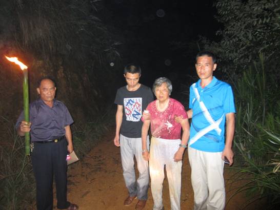 民警耐心地向這位老婦人詢問情況,無奈老婦人卻不能正確回答民警的提問,民警只好舉起火把小心翼翼地把這老婦人扶下山接回所內(nèi)安置。在派出所內(nèi),民警給老人端來熱茶,送上可口的飯菜,再次耐心細致地詢問她的情況,經(jīng)過長時間的詢問才得知她叫彭玉蘭是江蘇人,今年77歲了,是隨女兒來到岑溪的,今天早上外出,走著走著就到山里,現(xiàn)不知道怎樣回家。
