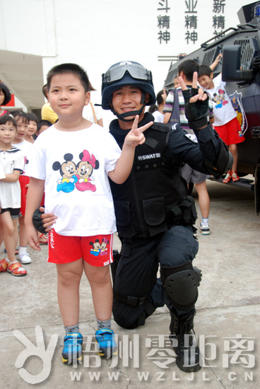 活動中,特巡警支隊民警給到場的小朋友及其家長依次介紹了支隊的“龍式”裝甲車、裝備車、布障車及特警單警作戰裝備,小朋友們第一次近距離的接觸警營文化,對先進的警用裝備充滿了好奇和向往,爭相與全副武裝的特警隊員合影留念,并立下了長大后也要當警察的“誓言”。