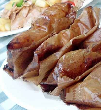 ????待一切準備就妥后。將花生油倒進油鑊,燒至微滾。然后就可將一包包的雞塊放到油鑊煎炸。由于有玉扣紙隔著,滾燙的油不與雞塊直接接觸。靠的是油的高溫將雞塊迫(逼)熟(炸出來的雞肉,金香爽滑,其氣撲鼻而無焦味,吃起來覺得奇香而不上火)。煎炸時要不停地用筷子夾著雞塊翻身。炸至七,八分鐘后即可起鑊。用碟子裝著送到餐桌客人的面前。吃的時候,將玉扣紙打開就可夾上口品嘗了。吃紙包雞一定要趁熱而吃。這樣,才能更好地品味出梧州紙包雞的色香味來。