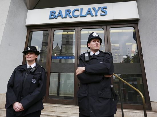 7月4日,倫敦,兩名警察站在巴萊克銀行門口,等候抗議利率操縱案的人群。