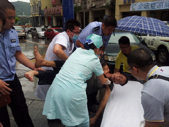 只見(jiàn)老漢半臥半趴地靠著路邊電線桿暈迷不醒,臉色發(fā)青,雙眼緊閉,口中還不時(shí)地吐著清口水。雨水打在他的身上,老漢不停地顫抖著。民警見(jiàn)狀,一邊用手機(jī)撥手120,請(qǐng)求救護(hù)車到場(chǎng)救助,一邊從車?yán)锬贸鲇陚悖徒?jīng)過(guò)的熱心小伙子一起,為老漢擋住打在其身上的雨水。兩分鐘后,救護(hù)車趕到現(xiàn)場(chǎng),孟警官協(xié)助醫(yī)生、護(hù)士們將老漢扶上擔(dān)架,送往醫(yī)院救治。 |