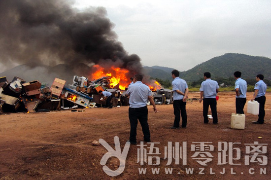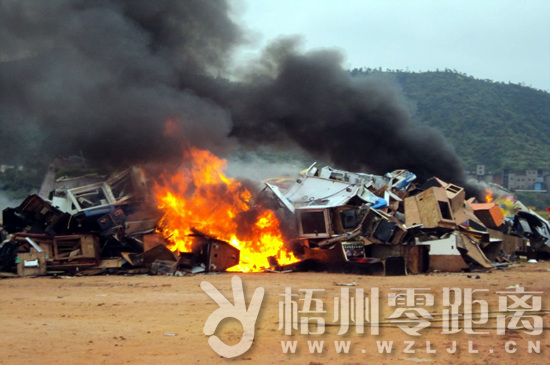 梧州零距離網訊(通訊員 林耀永)7月26日上午,岑溪市公安局根據梧州市公安局的統一部署,在岑溪市火車站附近一空地,對今年以來岑溪市公安局打擊賭博專項行動所繳獲的380多臺賭博游戲機、36塊賭博游戲機電腦主板進行了集中燒毀處理,經過熊熊大火的燃燒,這些物品很快變成了一堆灰燼。