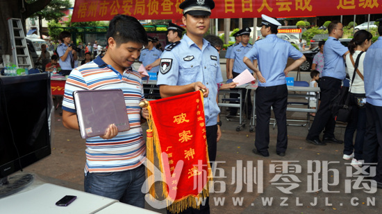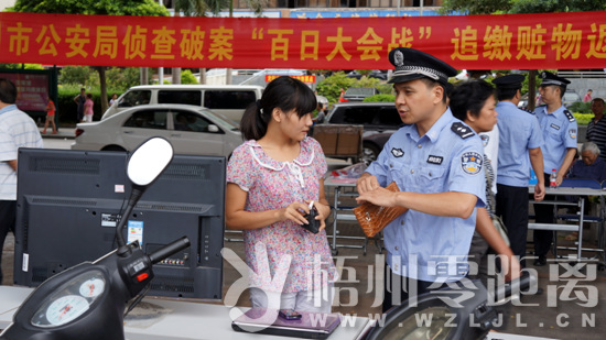 ??? 8月17日上午,我市公安局在鴛江麗港中心廣場舉行偵查破案“百日大會戰(zhàn)”追繳贓物返還大會,市民領回被盜的筆記本電腦。