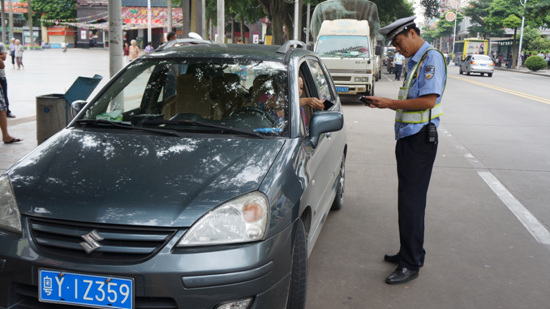8月23日,我市公安交警支隊(duì)在鴛江麗港中心廣場(chǎng)啟動(dòng)“集中整治機(jī)動(dòng)車涉牌涉證違法行為”專項(xiàng)行動(dòng),交警正在檢查一粵Y牌小車。據(jù)交警介紹,檢查車牌的駕駛證、行駛證以及保險(xiǎn)外,還會(huì)對(duì)比車牌號(hào)碼是否與登記的一致,如有可疑,將通過(guò)警務(wù)通進(jìn)一步查詢是否涉牌涉證違法行為。