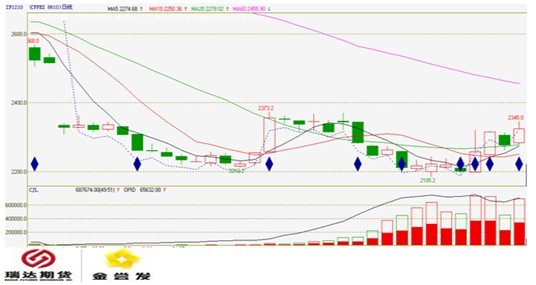 10月9日主力合約IF1210高開高走收漲2.07%,期指總持倉增加8.85%至90107手。IF1210主力前20名多頭增加6.87%至46822手,空頭增加14.81%至56308手,凈空持倉增加45.73%至12065手;主力前5名凈空持倉增加22.78%至17788手。總持倉回升至9萬手之上,多空雙向增倉,凈空持倉顯示主主力大部分逢高沽空,本輪反彈可持續性值得關注。技術面看,股指昨日收出一根放量的大陽線,并最終站上自6月份以來一直無法突破的60日均線,短期看多頭情緒有所抬頭,股指短線繼續反彈機會依然存在。總體來看,短期反彈行情仍有望延續,但由于本輪的下跌仍起于對于國內經濟的擔憂,未來多頭情緒的集聚或還需要時間和更多要素的逐步積累。今日期指或呈震蕩格局,IF1210支撐位2306.2,壓力位2339.5,日內采取高空低多策略。 |