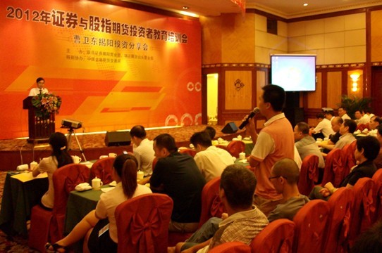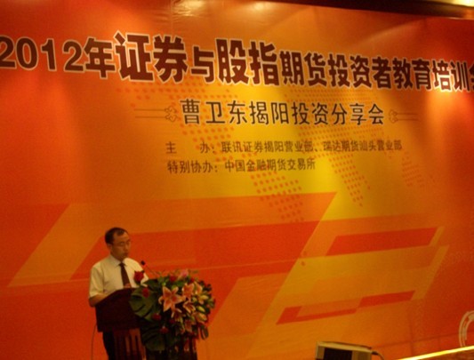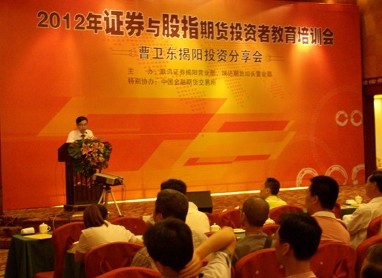 ????2012年中國股市半年報出爐,2012中國股市折騰半年還在原地踏步,但個股板塊輪動較快,投資者難于把握行情節奏,急需避險工具規避股市風險。為了幫助廣大投資者充分利用金融工具規避股票交易的風險,進一步了解掌握股指期貨專業知識及投資技巧,提高投資者的對沖風險能力。由瑞達期貨汕頭營業部、聯訊證券揭陽營業部主辦,中國金融期貨交易所特別協辦《2012年證券與股指期貨投資者教育培訓會》主題培訓會。特邀和訊信息高級分析師、《CCTV證券頻道》、《北京電視臺》資深證券嘉賓—曹衛東先生,瑞達期貨汕頭營業部講師曹冬祥先生。為投資者全面解讀2012年經濟形勢和證券及股指期貨市場投資機會和投資策略。培訓會得到了五大商業銀行揭陽分行、中國電信揭陽分公司、揭陽揭東電視臺等眾多機構的關注,投資者踴躍報名,可容納460人的會場座無虛席,現場氣氛活躍,本次投資者教育培訓會于2012年7月14日下午成功落下帷幕。
