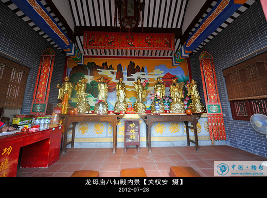 ????母廟依山面水,占地面積5000多平方米,由牌坊、前殿、中殿、后宮、行宮、龜池、商場等組成。正殿雄偉莊嚴、雕梁畫棟,前座正殿中供奉著龍母像,善男信女們多到此殿朝拜,以祈龍母賜福庇佑,故正殿前庭,一年四季香火不斷。右側殿供奉傅大將軍像,左側殿供奉龍太子。正殿后的中座,懸掛著龍母進京巨幅浮雕。后宮陳列著龍母床和龍太子床,主殿右側為龍母行宮,為接待室。
