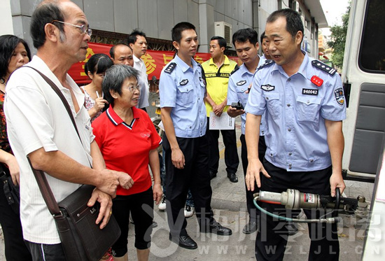 ????“這是反光指揮棒,藍色代表安全通行,黃色表示警示,紅色表示禁令。”當天上午,梧州市公安局交警支隊高速公路管理四大隊大隊長張志華,正向參觀的市民介紹反光指揮棒的用法。另一邊,市民也正饒有興致地觀看破胎器、車門破解器等警用設備,現場的交警也耐心向大家介紹各種設備的作用。