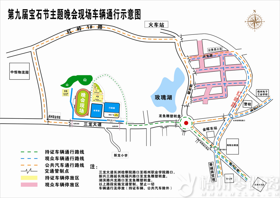 針對當晚寶石節主題晚會,交警部門將于11月2日零時起實施交通管制,由于搭建、拆卸觀眾驗票安檢通道的需要,零時至24時,將在三龍大道(梧州高中東門至駿錦4S店)路段實行交通管制。當晚18時至寶石節主題晚會結束,梧州市三龍大道(長洲檢察院路口至梧州職業學院路口)、新興三路延長線(福興路口至龍魚雕塑轉盤)、湖濱路(龍魚雕塑轉盤至興龍路路口)禁止一切無晚會通行證的車輛通行、停放。