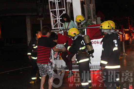 梧州零距離網訊(通訊員 李正文 林耀永)11月11日凌晨,岑溪市某停業KTV起火,8人被困在6樓,消防搜救人員全副武裝快速進入樓內搜救被困人員并將8人轉移至頂樓,最后由消防云梯車將受困者全部救下。