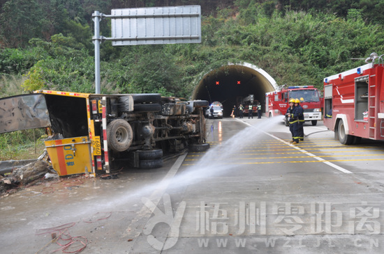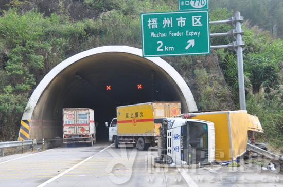 梧州零距離網(wǎng)訊(通訊員 李研銘)11月22日上午10時(shí)30分左右,包茂高速?gòu)V西梧州段倒水往梧州方向大柚墉隧道口發(fā)生一起貨車側(cè)翻事故,小貨車上裝載了三噸巖石乳化炸藥,車上兩名押運(yùn)人員身受輕傷,情況十分緊急。
