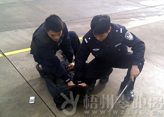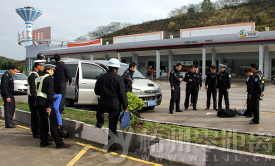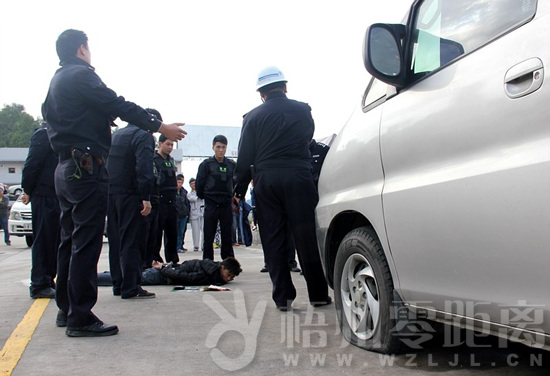很快,一輛灰色面包車高速朝收費站方向飛馳而來,后面一輛廣東牌照的警車呼嘯著警笛緊緊跟著,面包車駕駛員見前面收費站有警察嚴(yán)陣以待,無路可逃之際轉(zhuǎn)彎駛?cè)肱赃叺姆?wù)區(qū),車一停下兩男子打開車門奪路而逃。民警見狀立刻徒步飛奔過去,和廣東牌照警車下來的民警一道對兩嫌疑人展開圍捕,很快,經(jīng)過抱膝摔等幾招漂亮的擒拿動作,兩名嫌疑人被警察制服按倒在地,抓捕行動順利完成。