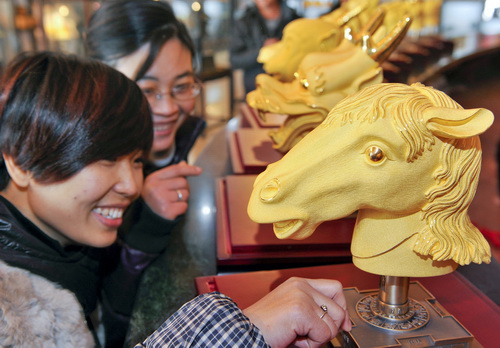 ????【游客觀看黃金版圓明園十二生肖獸首】“十二生肖獸首人身”像原是圓明園海晏堂前的扇形水池噴水臺上的噴泉形象,是由意大利籍傳教士郎世寧設(shè)計的一座兼容東西方風(fēng)格的“獸首人身水力鐘”的重要組成部分。這些獸首人身像,以盤坐之態(tài)作半月形分列噴泉左右,會按其所代表的12個時辰,依次輪流噴水報時。