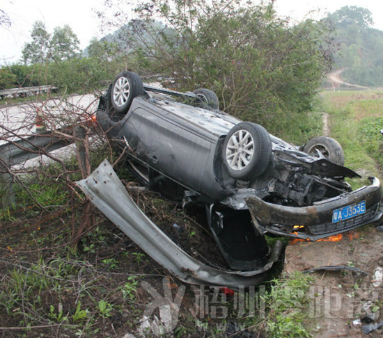 高速三大隊值班民警接到報警后,迅速趕赴事故現(xiàn)場,到達現(xiàn)場時,這臺粵A牌照的小車已經(jīng)四腳朝天仰翻在高速公路排水溝里,擋風玻璃已經(jīng)破碎、車頭受到一定程度的損壞,車身上有多處明顯的擦痕,高速公路旁的樹木也被該車撞倒。駕駛?cè)吮砬榇舸舻卣驹谝慌裕┰S時間方回過神來。民警馬上聯(lián)合岑溪交警大隊民警在事故現(xiàn)場后面設置反光錐筒和提示標志,以防二次事故發(fā)生,并對事故現(xiàn)場進行勘察。