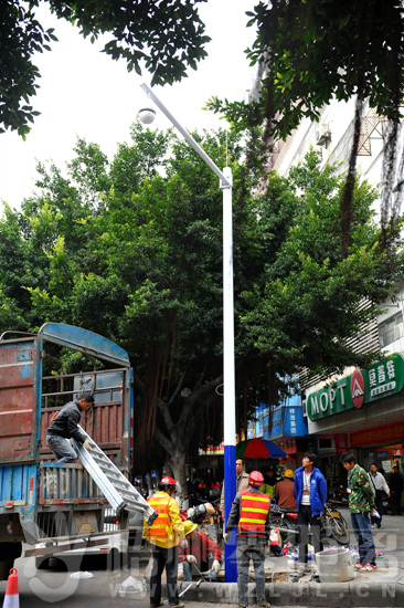 ??? 12月12日,工程人員在潘塘附近路段安裝“天網”攝像頭。目前,“天網”工程正在我市多個路段繼續鋪開建設,“天網”的覆蓋范圍正在市內不斷擴大,管線的埋設也在多路段順利進行。記者 何鎏/攝