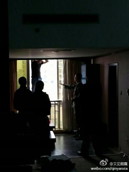 輕生男子站在窗臺上,身體大部分已伸出窗外。