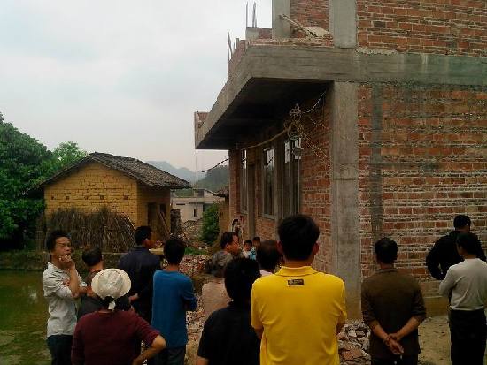 原來鐘某進正在蓋新房子,本來地基已經蓋到了邊界,在蓋二樓的時候超出來一米多的屋檐,屋檐下是一條通往鐘某坤家祖屋的道路,鐘某坤的人認為,鐘某進二樓超出的屋檐(陽臺)蓋過了道路,以后通往祖屋的道路會被鐘某進阻塞,不能通行,所以鐘某坤帶10多人把鐘某進屋檐(陽臺)上墻體全部推毀。