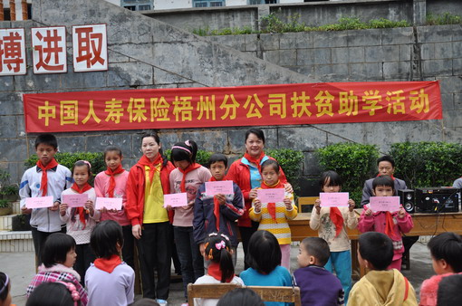 ????4月13日,在中國人壽梧州分公司副總經理、工會主任馬曖潔的帶領下,梧州分公司工會、團委的部分代表來到岑溪市垌尾村小學,將全體女職工、團員捐贈的3500多元助學款交到困難學生手中。隨后,中國人壽員工代表還與小學生們進行了有獎游藝活動,在笑聲中渡過了快樂的一天!