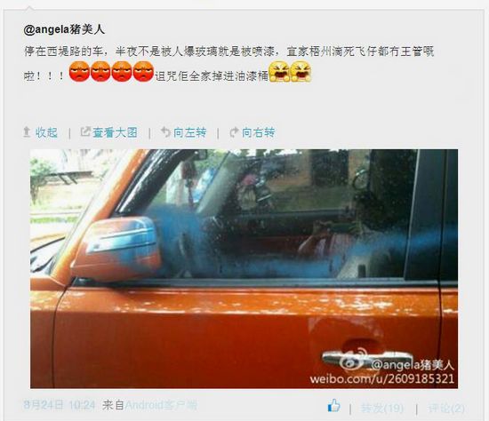 8月24日,停在西堤路臨時停車線內的車輛,車窗和車后視鏡被人噴了油漆。(來自新浪微博網友 angela豬美人)