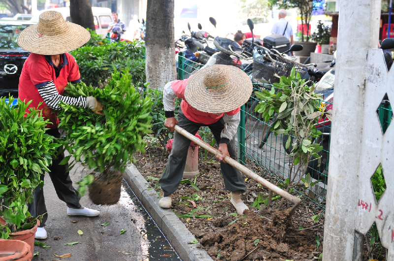 ????日前,在文瀾路怡景酒店對出路段綠化帶,園林工人正栽種植物。