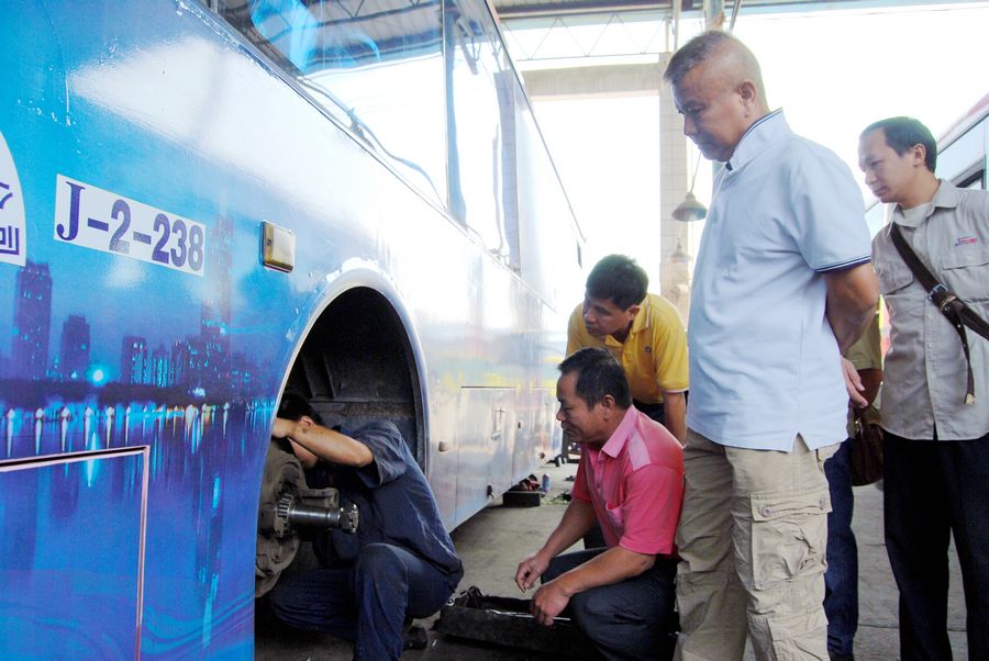 ?9月27日,技術(shù)工人在安檢人員的監(jiān)督下,對公交車進(jìn)行保養(yǎng)維修。梧州珍寶巴士公司將每月的安全生產(chǎn)大檢查和節(jié)假日安全重點(diǎn)檢查列為重要工作內(nèi)容,每次都由公司領(lǐng)導(dǎo)帶隊(duì),到各公交線路進(jìn)行督查,從源頭上抓好安全工作。 黃健泉 攝
