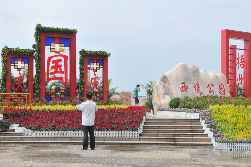 9月30日,西堤公園一處小廣場已完成慶祝國慶造型花壇擺設,吸引市民前來觀賞、攝影。 李鴻榮 攝