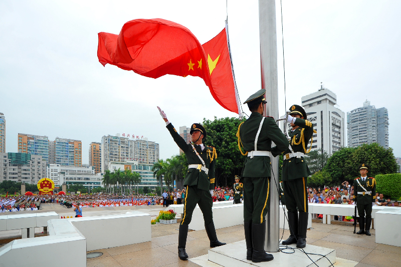 ????8時(shí)30分許,儀仗隊(duì)和國(guó)旗護(hù)衛(wèi)隊(duì)踏著堅(jiān)實(shí)有力的正步,向市政廣場(chǎng)中央的國(guó)旗臺(tái)走來,全場(chǎng)肅立注視。接著,主持人朗聲宣布升國(guó)旗、奏國(guó)歌,由武警戰(zhàn)士擔(dān)任的升旗手將五星紅旗高高揚(yáng)起。在激越的國(guó)歌聲中,五星紅旗冉冉升起,部隊(duì)官兵代表行軍禮,少先隊(duì)員行隊(duì)禮,各界人士代表和群眾行注目禮。