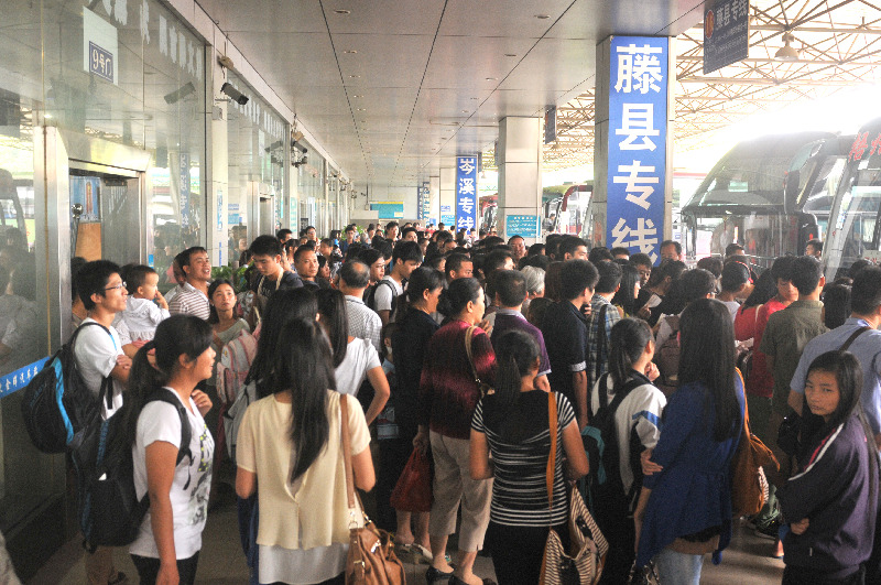 ??? 眾多乘客在金暉汽車站站臺內等候上車。國慶長假首日,我市客運迎來客流出行高峰,公路、鐵路運輸呈現一派繁忙景象。 西江都市報記者 蒙紹松/攝