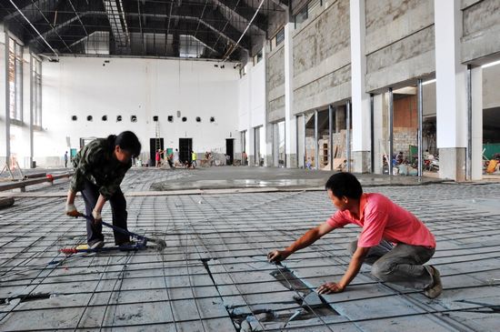 10月1日,在南廣鐵路藤縣站站房內,工人在布鋼筋搗制地板。國慶假期,南廣鐵路藤縣站各施工隊正常施工,開展站外地面平整、站房裝修、站臺清潔、鐵軌檢測等工作。 蘇杰生 攝