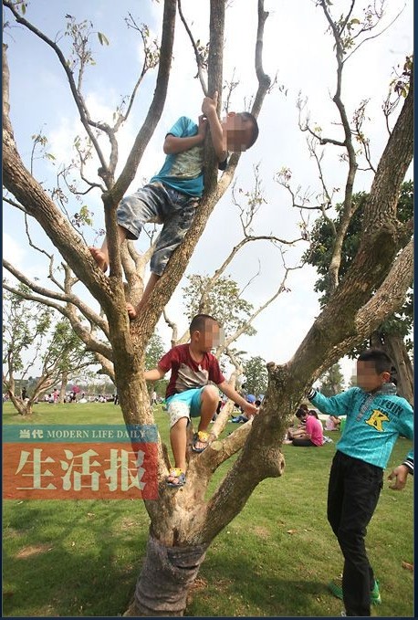 小朋友爬到樹上玩耍。(來源:廣西新聞網-當代生活報)
