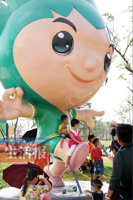 兩位小朋友坐在吉祥物“桃桃”的腿上。(來源:廣西新聞網-當代生活報)