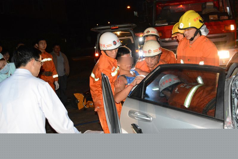 ????當日凌晨1時15分,救援人員趕到現場,現場一輛車牌為桂DK80××的小轎車和桂D367××貨車對向緊緊貼在一起,小轎車司機被困于駕駛室,車身嚴重變形。兩車側方停放著一輛桂D263××的貨車,該貨車車頭右下角受損,車內無人員受困。根據現場情況,消防官兵立即攜帶撬棍等裝備深入小車內部,一邊安撫受困司機,一邊展開營救。1時22分,小車司機從后門被救出并立即送往醫院救治。