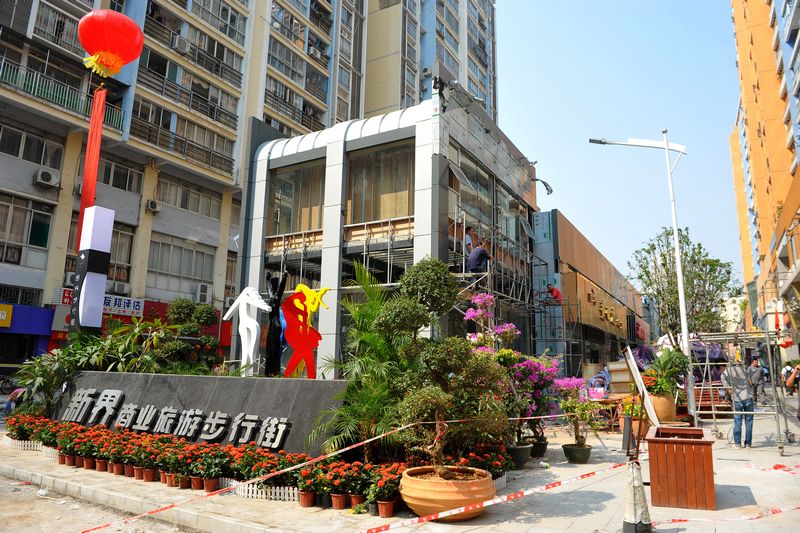 ?目前進駐商鋪都在忙于室內(nèi)裝修,場外地磚的鋪設也進入最后階段。西江都市報記者 何鎏/攝