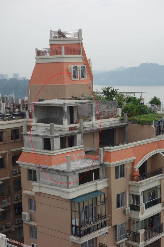圈中所示的三處房屋,是21號樓頂層的私自加建部分。 西江都市報記者 龍天傳/攝