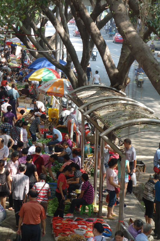 每天清晨,新興菜市入口處都像一座“圍城”:里面的人想出來,外面的人想進去。該局面的形成并不是因為入口道路的寬度不夠,而是因為道路上有太多的攤檔占道經營。類似的情況,還長期存在于市內各大市場的周邊。