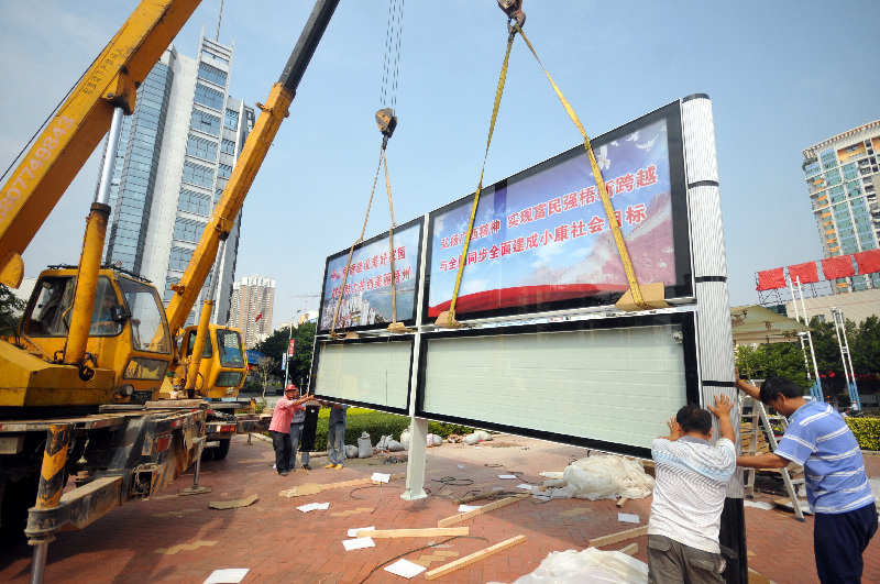 10月15日,施工人員在市政廣場(chǎng)安裝新型的閱報(bào)欄。西江都市報(bào)記者 蒙紹松/攝