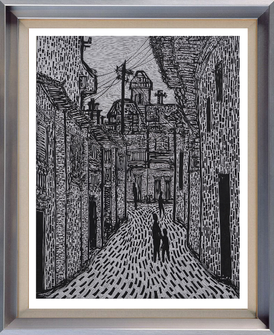 ????來自藤縣的梁繼文2007年到梧州工作,由此全面領略到騎樓的韻味并被深受吸引,于是經常帶著攝像機走街串巷找素材。一個傍晚,他行至小南路時,看到夕陽映照下的騎樓城仿佛披上了一層輕紗,那份特有的寧靜觸動了他的創作靈感。制板、作草圖、刻板,他花了幾個月的時間,終于創作出了《騎樓瀚韻》。